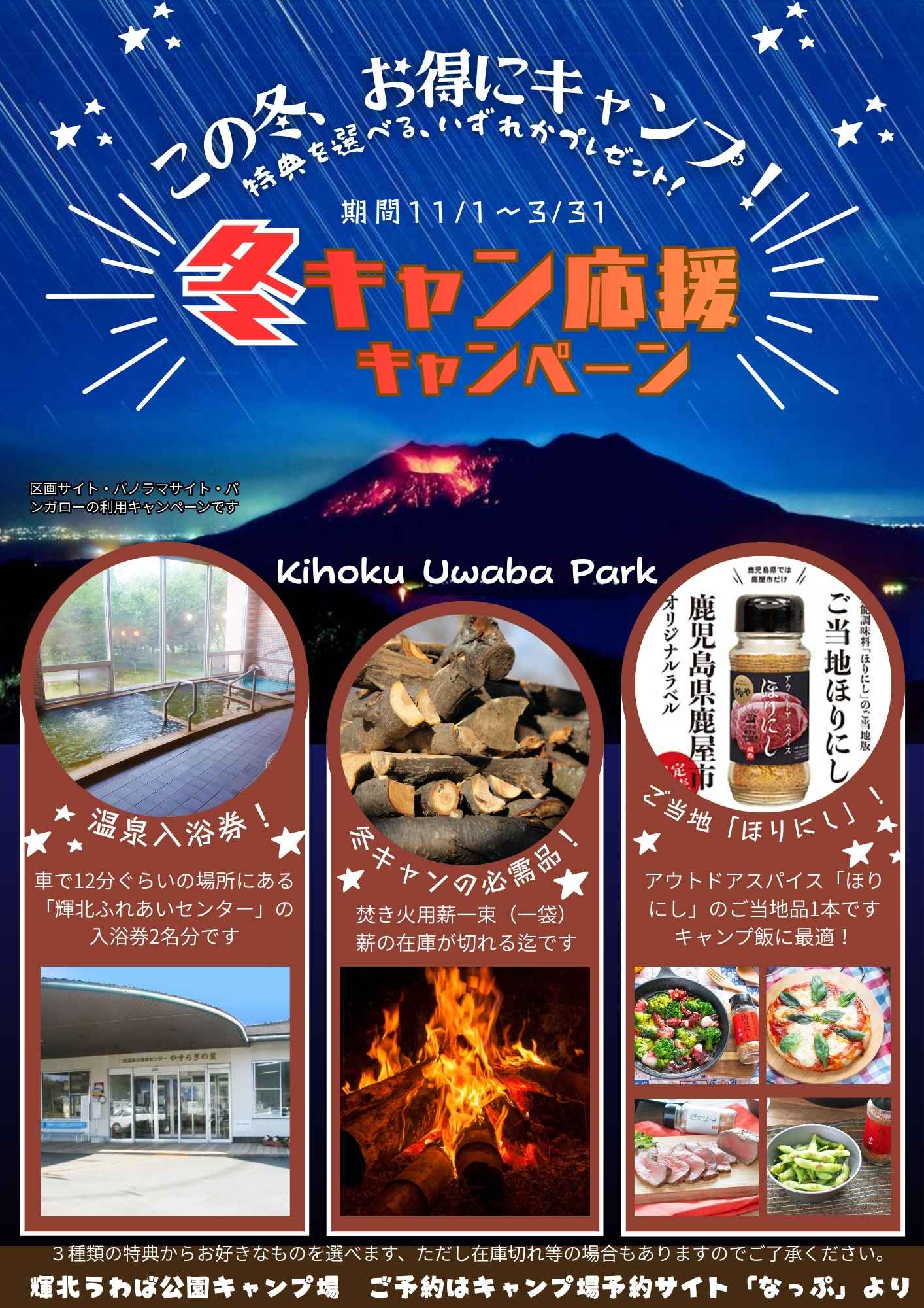 11/1〜3/31までの期間にバンガロー・パノラマテントサイト・区画テントサイトをご利用の方に以下の3つのなかから一つプレゼントします。(チャックイン時に選べます)